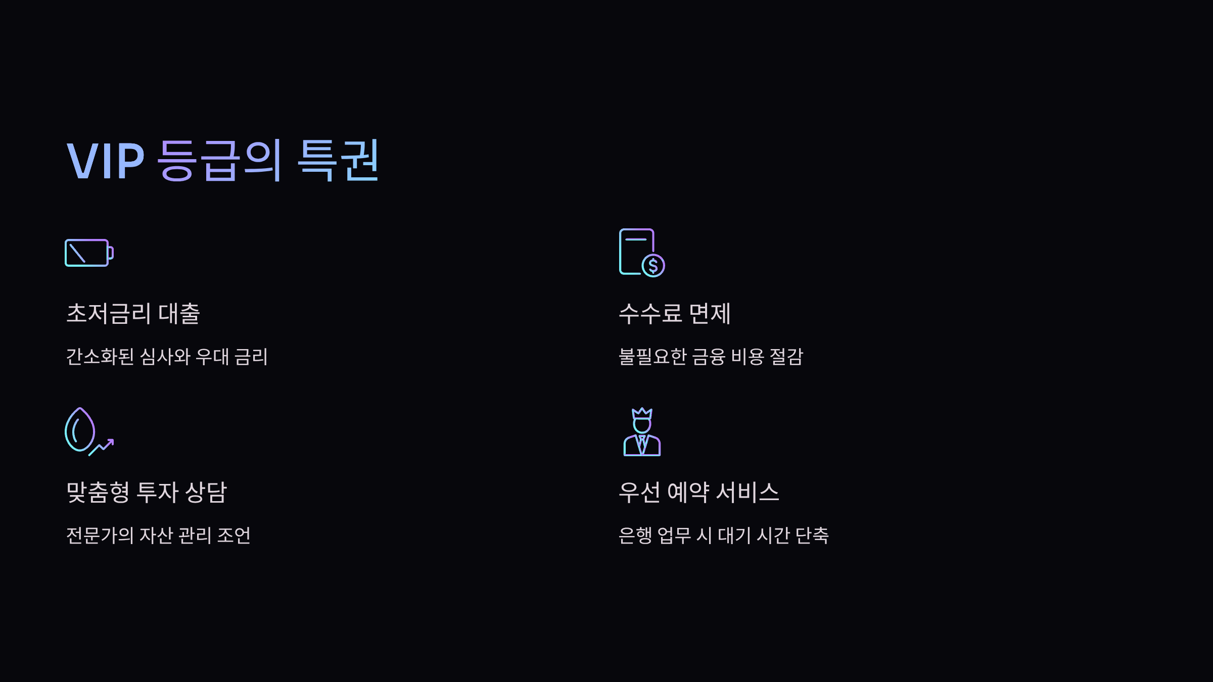 VIP 등급을 받게 되면 정말 다양한 특권을 누릴 수 있습니다. 대표적으로 대출 심사가 간소화되거나, 심지어 초저금리 대출을 받을 수 있는 기회가 생기기도 합니다. 뿐만 아니라 각종 수수료 면제, 맞춤형 투자 상담, 그리고 은행 업무 시 우선 예약 서비스 같은 편리함도 제공됩니다.