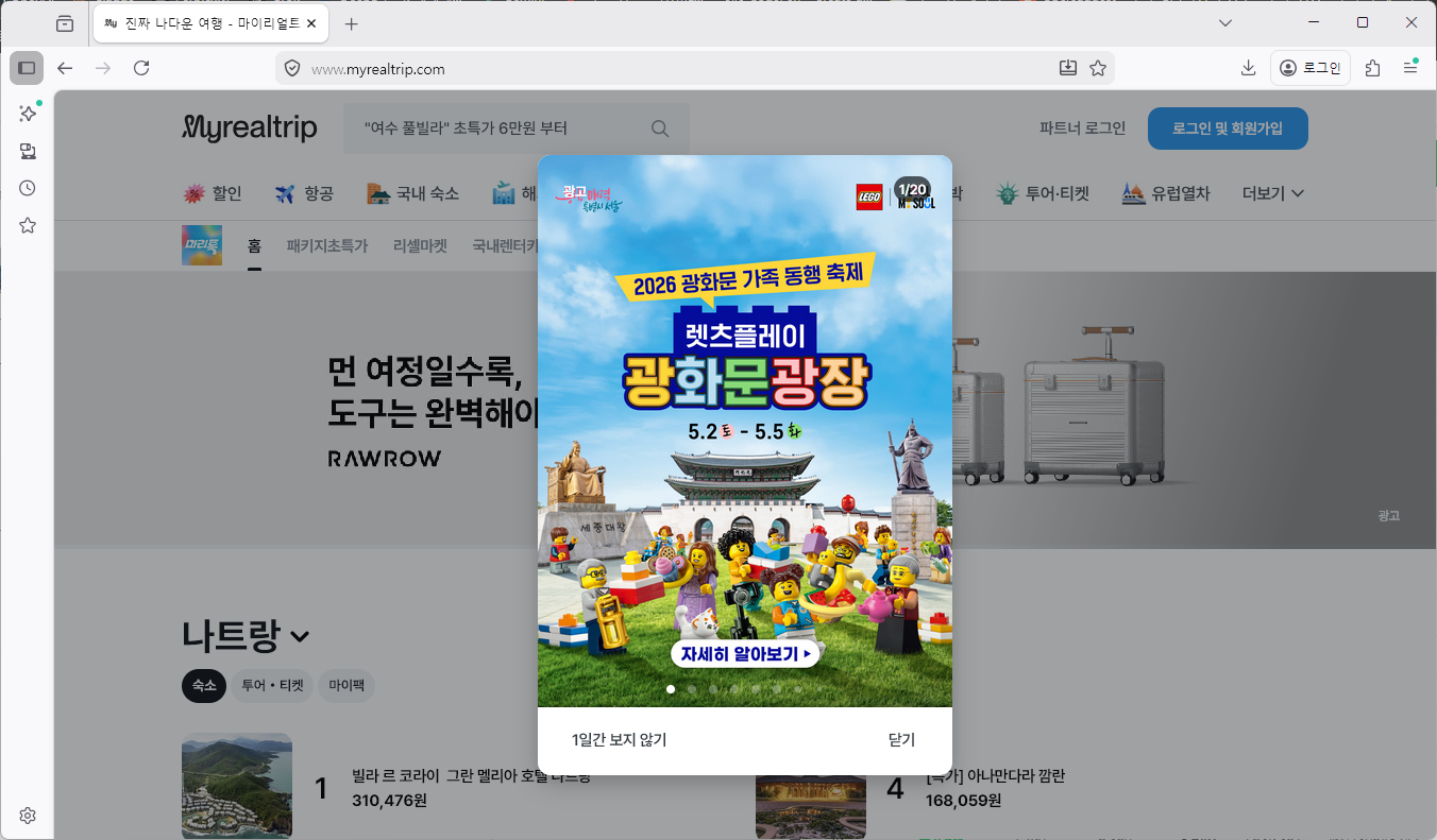 마이리얼트립 홈페이지는 항공권, 숙박, 투어, 액티비티를 한 번에 예약할 수 있는 한국 대표 여행 플랫폼입니다. 80개국 680여 도시에서 18,200개 이상의 상품을 제공하죠.